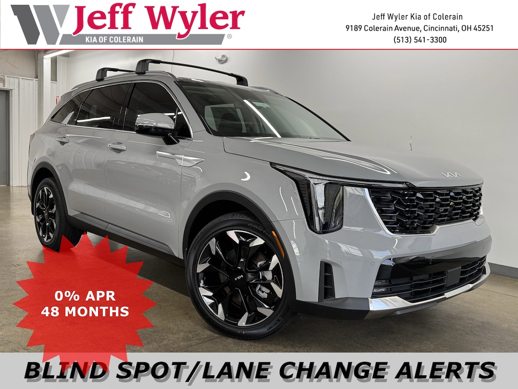 Jeff Wyler Kia of Colerain is very proud to offer this terrific-looking 2025 Kia Sorento EX in Wolf Gray. Panoramic Sunroof Package (LED Interior Lighting and Panoramic Power Sunroof w/Power Sunshade), 3rd row seats: split-bench, 4-Wheel Disc Brakes, 6 Speakers, ABS brakes, Air Conditioning, All Weather Mats, Alloy wheels, AM/FM radio: SiriusXM, Apple CarPlay & Android Auto, Auto High-beam Headlights, Auto-Dimming Mirror w/HomeLink (PnP), Auto-dimming Rear-View mirror, Automatic temperature control, Brake assist, Bumpers: body-color, Cross Bars, Delay-off headlights, Driver door bin, Driver vanity mirror, Dual front impact airbags, Dual front side impact airbags, Electronic Stability Control, Emergency communication system: 911 Connect, Exterior Parking Camera Rear, Four wheel independent suspension, Front anti-roll bar, Front Bucket Seats, Front Center Armrest, Front dual zone A/C, Front fog lights, Front reading lights, Fully automatic headlights, Heated door mirrors, Heated Front Bucket Seats, Heated front seats, Illuminated entry, Knee airbag, Leather Shift Knob, Leather steering wheel, Low tire pressure warning, Navigation System, Occupant sensing airbag, Outside temperature display, Overhead airbag, Overhead console, Panic alarm, Passenger door bin, Passenger vanity mirror, Power door mirrors, Power driver seat, Power Liftgate, Power passenger seat, Power steering, Power windows, Radio data system, Radio: AM/FM Standard Sound System, Rear anti-roll bar, Rear reading lights, Rear side impact airbag, Rear window defroster, Rear window wiper, Remote keyless entry, Security system, Speed control, Speed-sensing steering, Split folding rear seat, Spoiler, Steering wheel mounted audio controls, SynTex Artificial Leather Seat Trim, Tachometer, Telescoping steering wheel, Tilt steering wheel, Traction control, Trip computer, Turn signal indicator mirrors, Variably intermittent wipers, and Wheels: 20" Machine-Finished Gloss Black Alloy Our PRE-OWNED vehicles are put through a rigorous 167- POINT QUALITY ASSURANCE INSPECTION along with an average amount of over $1,400.00 SPENT to recondition each vehicle so we can be sure to deliver you the highest quality vehicle like you deserve! ***ONLINE PRICE DOES NOT INCLUDE WYLER FAMILY FIRST PACKAGE***