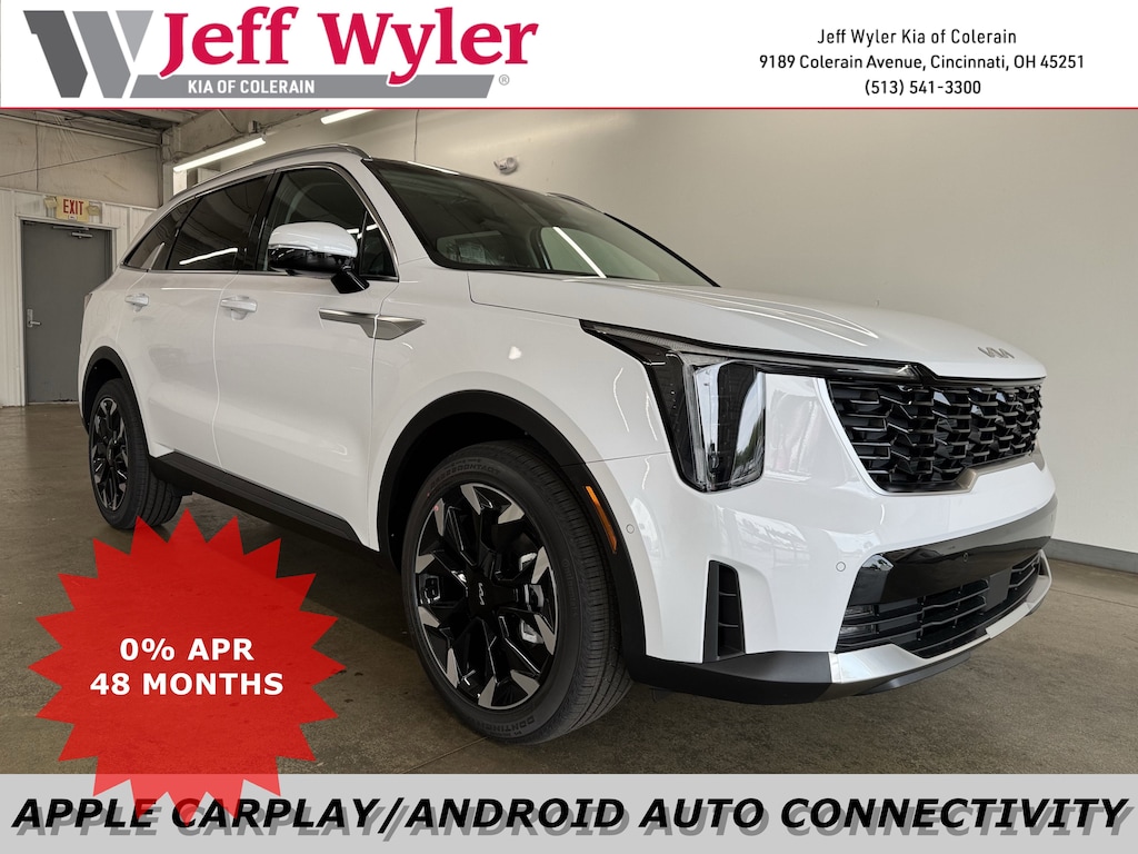 Jeff Wyler Kia of Colerain is honored to offer this fantastic-looking 2025 Kia Sorento SX in Glacial White Pearl. 3rd row seats: split-bench, 4-Wheel Disc Brakes, 6 Speakers, ABS brakes, Air Conditioning, All Weather Mats, Alloy wheels, AM/FM radio: SiriusXM, Apple CarPlay & Android Auto, Auto High-beam Headlights, Auto-Dimming Mirror w/HomeLink (PnP), Auto-dimming Rear-View mirror, Automatic temperature control, Brake assist, Bumpers: body-color, Delay-off headlights, Driver door bin, Driver vanity mirror, Dual front impact airbags, Dual front side impact airbags, Electronic Stability Control, Emergency communication system: 911 Connect, Exterior Parking Camera Rear, Four wheel independent suspension, Front anti-roll bar, Front Bucket Seats, Front Center Armrest, Front dual zone A/C, Front fog lights, Front reading lights, Fully automatic headlights, Heated & Ventilated Front Bucket Seats, Heated door mirrors, Heated front seats, Illuminated entry, Knee airbag, Leather Shift Knob, Leather steering wheel, Low tire pressure warning, Navigation System, Occupant sensing airbag, Outside temperature display, Overhead airbag, Overhead console, Panic alarm, Passenger door bin, Passenger vanity mirror, Power door mirrors, Power driver seat, Power Liftgate, Power moonroof, Power passenger seat, Power steering, Power windows, Radio data system, Radio: AM/FM Standard Sound System, Rain sensing wipers, Rear anti-roll bar, Rear reading lights, Rear side impact airbag, Rear window defroster, Rear window wiper, Remote keyless entry, Security system, Speed control, Speed-sensing steering, Split folding rear seat, Spoiler, Steering wheel mounted audio controls, SynTex Artificial Leather Seat Trim, Tachometer, Telescoping steering wheel, Tilt steering wheel, Traction control, Trip computer, Turn signal indicator mirrors, Variably intermittent wipers, Ventilated front seats, and Wheels: 20" Machine-Finished Gloss Black Alloy Our PRE-OWNED vehicles are put through a rigorous 167- POINT QUALITY ASSURANCE INSPECTION along with an average amount of over $1,400.00 SPENT to recondition each vehicle so we can be sure to deliver you the highest quality vehicle like you deserve! ***ONLINE PRICE DOES NOT INCLUDE WYLER FAMILY FIRST PACKAGE***