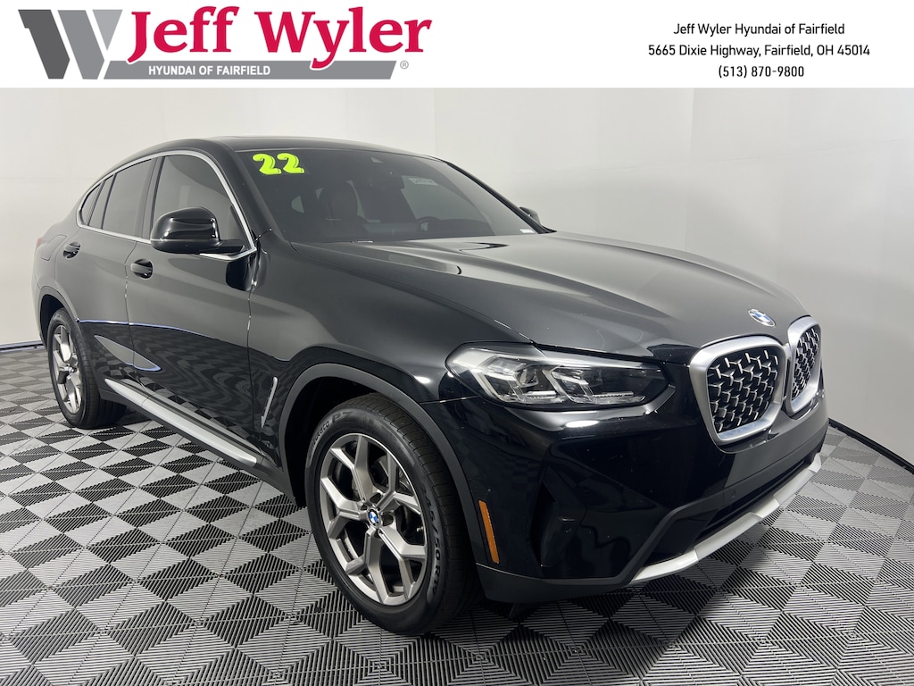 CARFAX One-Owner. Clean CARFAX. Jeff Wyler Hyundai of Fairfield is honored to offer this outstanding 2022 BMW X4 xDrive30i in Jet Black. Well equipped with: Connected Package Pro, Premium Package 2 (Comfort Access Keyless Entry, Gesture Control, Heated Front Seats, Heated Steering Wheel, and Lumbar Support), Android Auto, Apple CarPlay, CALL NOW FOR YOUR VIP APPOINTMENT 513-870-9800, FULLY SERVICED w/RECORDS, GUARANTEED FINANCING!! NO MATTER YOUR SITUATION WE CAN GET AN APPROVAL!!, THE #1 Volume dealer in the region! Come see why for yourself Today!!, WE PAY MORE FOR YOUR TRADE!!, 12 Speakers, 3.39 Axle Ratio, 4-Wheel Disc Brakes, ABS brakes, Air Conditioning, Alloy wheels, AM/FM radio: SiriusXM with 360L, Anti-whiplash front head restraints, Apple CarPlay & Android Auto Compatibility, Auto High-beam Headlights, Auto-dimming door mirrors, Auto-dimming Rear-View mirror, Automatic temperature control, BMW Assist eCall, BMW TeleServices, Brake assist, Bumpers: body-color, ConnectedDrive Services, Delay-off headlights, Driver door bin, Driver vanity mirror, Dual front impact airbags, Dual front side impact airbags, Electronic Stability Control, Emergency communication system: BMW Assist eCall, Enhanced Bluetooth, Exterior Parking Camera Rear, Fine Wood Open-Pored Ash Grain Trim, Four wheel independent suspension, Front anti-roll bar, Front Bucket Seats, Front Center Armrest, Front dual zone A/C, Front reading lights, Fully automatic headlights, Garage door transmitter, Genuine wood dashboard insert, Genuine wood door panel insert, Heated door mirrors, Hi-Fi Sound System, Illuminated entry, Knee airbag, Live Cockpit Pro w/Navi, Low tire pressure warning, Memory seat, Navigation System, Occupant sensing airbag, Outside temperature display, Overhead airbag, Panic alarm, Passenger door bin, Passenger vanity mirror, Perforated SensaTec Upholstery, Power door mirrors, Power driver seat, Power Front Seats, Power Liftgate, Power moonroof: Panorama, Power passenger seat, Power steering, Power windows, Radio Control US, Radio data system, Radio: AM/FM Audio System, Rain sensing wipers, Rear air conditioning, Rear anti-roll bar, Rear reading lights, Rear seat center armrest, Rear window defroster, Remote keyless entry, Security system, SiriusXM w/360L, Speed control, Speed-sensing steering, Speed-Sensitive Wipers, Split folding rear seat, Spoiler, Sport Seats, Sport steering wheel, Steering wheel mounted audio controls, Tachometer, Telescoping steering wheel, Tilt steering wheel, Traction control, Trip computer, Turn signal indicator mirrors, Variably intermittent wipers, Wheels: 19" x 7.5" Y-Spoke (Style 693), and WiFi Hotspot. TO CHECK ON THE AVAILABILITY OF THIS VEHICLE REACH OUT TO ONE OF OUR TEAM MEMBERS!! ALSO SHOP ONLINE AT https://www.jeffwylerhyundaioffairfield.com/ Proudly Serving: Cincinnati, Dayton, Columbus, Louisville, Lexington, Indianapolis, Hamilton, Florence, Alexandria, Beavercreek, Springdale, West Chester, Monroe, Fairfield, Kenwood, Newport and all of greater Cincinnati Ohio, Indiana, and Northern Kentucky.