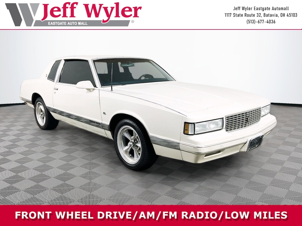 Jeff Wyler Eastgate Auto Mall is pleased to offer this fantastic-looking 1987 Chevrolet Monte Carlo LS in White. Well equipped with: Clean CARFAX. Ask about available certifications. Used vehicles 10 years of age or newer with less than 100,000 miles are eligible for the Wyler Assurance Program, but eligible vehicles must pass our reconditioning process and multi-point inspection. Provided the vehicle passes inspection, vehicles will be eligible for the 6 month/6,000 mile limited warranty. The 6 month/6,000 mile limited warranty is NOT available on AS-IS vehicles, wholesale vehicles, lease buyback/pass-thru vehicles or un-inspected vehicles. Note that this program can also apply to vehicles where the remaining factory coverage is less than 6 months or 6,000 miles. Please check the Federal Trade Commission (FTC) Buyers guide on the vehicle for full details as to whether or not warranty coverage may apply. Contact Dealer for additional details. The Wyler Assurance 6 month/6,000 Mile limited warranty ends 6 months from the date of the Retail Purchase Agreement (BUYERS ORDER) or when the vehicle's odometer registers 6,000 additional miles to the mileage listed on the BUYERS ORDER, whichever comes first. Your Deductible - The warranty holder on your contract pays the first $100 of each covered repair.