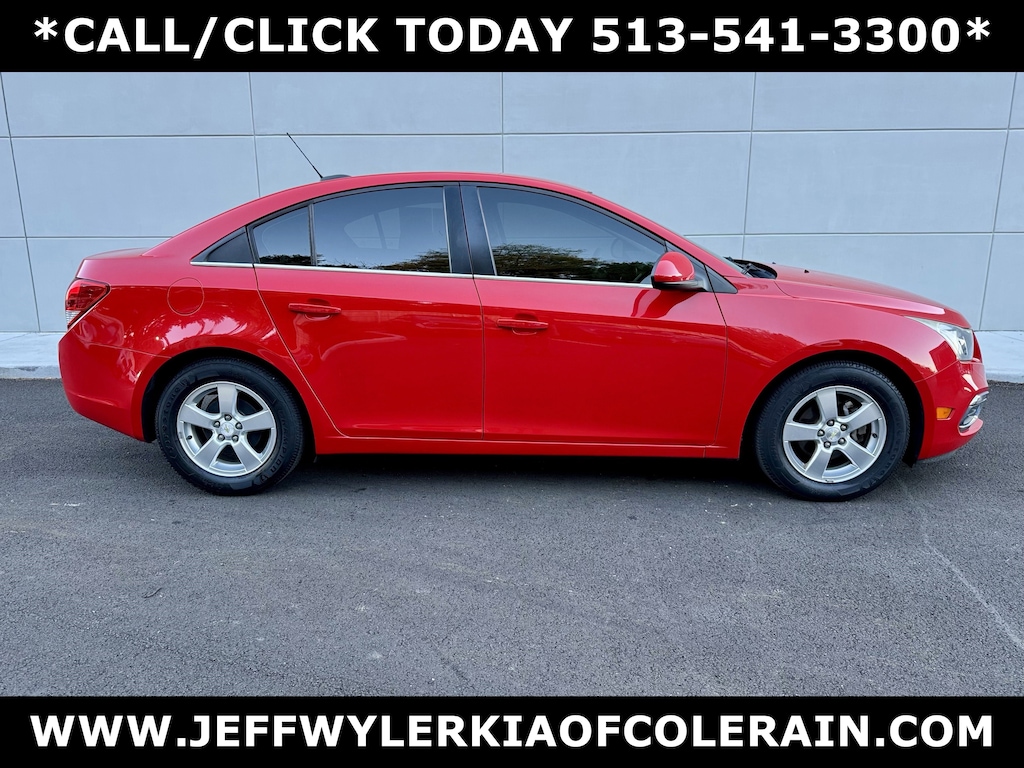 Jeff Wyler Kia of Colerain is excited to offer this good-looking 2015 Chevrolet Cruze 1LT in Red Hot. 1LT Driver Convenience Package (Auto-Dimming Inside Rear-View Mirror, Driver 6-Way Power Seat Adjuster, Driver/Front Passenger Illuminated Vanity Mirrors, Outside Heated Power-Adjustable Body-Color Mirrors, and Remote Vehicle Starter System), Preferred Equipment Group 1SD, 16" Painted Aluminum Wheels, 6 Speaker Audio System Feature, 6 Speakers, 6-Way Manual Driver Seat Adjuster, ABS brakes, Air Conditioning, Alloy wheels, AM/FM radio: SiriusXM, AM/FM Stereo w/CD Player/MP3 Playback, Brake assist, Bumpers: body-color, Cargo Net, CD player, Compass, Delay-off headlights, Driver door bin, Driver vanity mirror, Dual front impact airbags, Dual front side impact airbags, Electronic Stability Control, Emergency communication system: OnStar Directions & Connections, Front anti-roll bar, Front Bucket Seats, Front Center Armrest, Front License Plate Bracket, Front Passenger 6-Way Manual Seat Adjuster, Front reading lights, Front wheel independent suspension, Fully automatic headlights, Illuminated entry, Knee airbag, Low tire pressure warning, Occupant sensing airbag, Outside temperature display, Overhead airbag, Panic alarm, Passenger door bin, Passenger vanity mirror, Power door mirrors, Power steering, Power windows, Premium Cloth Seat Trim, Radio data system, Rear seat center armrest, Rear side impact airbag, Rear window defroster, Remote keyless entry, Security system, SiriusXM Satellite Radio, Speed control, Speed-sensing steering, Split folding rear seat, Steering wheel mounted audio controls, Tachometer, Telescoping steering wheel, Tilt steering wheel, Traction control, Trip computer, Variably intermittent wipers, and Voltmeter Our PRE-OWNED vehicles are put through a rigorous 167- POINT QUALITY ASSURANCE INSPECTION along with an average amount of over $1,400.00 SPENT to recondition each vehicle so we can be sure to deliver you the highest quality vehicle like you deserve! ***ONLINE PRICE DOES NOT INCLUDE WYLER FAMILY FIRST PACKAGE***