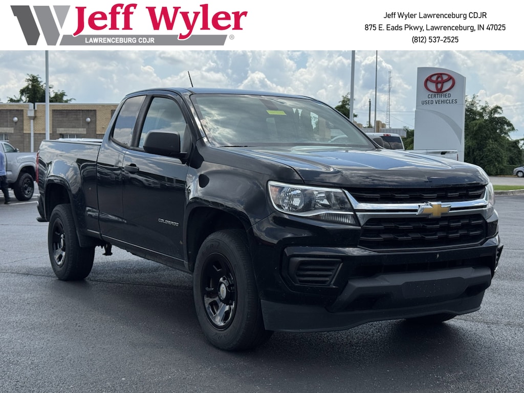 Jeff Wyler Chrysler Dodge Jeep of Lawrenceburg is proud to offer this outstanding-looking 2021 Chevrolet Colorado Work Truck in Black. Preferred Equipment Group 2WT, 4-Wheel Disc Brakes, 4.10 Rear Axle Ratio, 6 Speakers, 6-Speaker Audio System Feature, ABS brakes, Air Conditioning, AM/FM radio: SiriusXM, Apple CarPlay/Android Auto, Bumpers: body-color, Delay-off headlights, Driver 4-Way Power Seat Adjuster, Driver door bin, Dual front impact airbags, Dual front side impact airbags, Electronic Stability Control, Exterior Parking Camera Rear, Front anti-roll bar, Front Bucket Seats, Front Center Armrest, Front License Plate Kit, Front wheel independent suspension, Full-Length Black Vinyl Floor Covering, Fully automatic headlights, Low tire pressure warning, Occupant sensing airbag, Overhead airbag, Passenger door bin, Passenger vanity mirror, Power driver seat, Power steering, Power windows, Premium audio system: Chevrolet Infotainment 3, Radio data system, Radio: Chevrolet Infotainment 3 System, Rear step bumper, SiriusXM Radio, Speed-sensing steering, Split folding rear seat, Tachometer, Tilt steering wheel, Traction control, Trip computer, Variably intermittent wipers, Vinyl Seat Trim, and Wheels: 17" x 8" Ultra Silver Metallic Steel Our PRE-OWNED vehicles are put through a rigorous 167- POINT QUALITY ASSURANCE INSPECTION along with an average amount of over $1,400.00 SPENT to recondition each vehicle so we can be sure to deliver you the highest quality vehicle like you deserve! ***ONLINE PRICE DOES NOT INCLUDE WYLER FAMILY FIRST PACKAGE*** Stop by 4136 Shelbyville Road to see for yourself, or give us a call @ 502-897-3151 to schedule your test drive! Ask about available certifications.