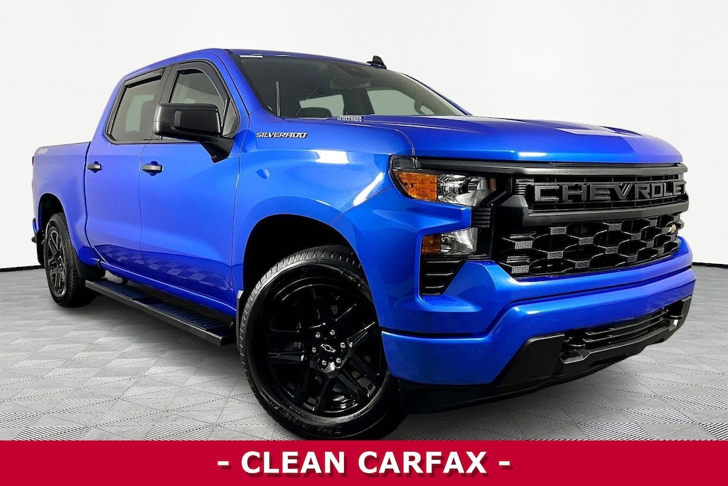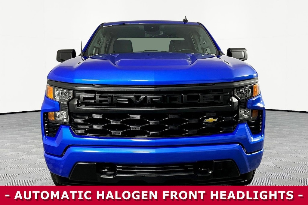 Clean CARFAX. Riptide Blue Metallic 2025 Chevrolet Silverado 1500 Custom 4WD 8-Speed Automatic 2.7L I4 Turbocharged DOHC 16V LEV3-SULEV30 310hp 8-Speed Automatic, 4WD, Black Cloth.