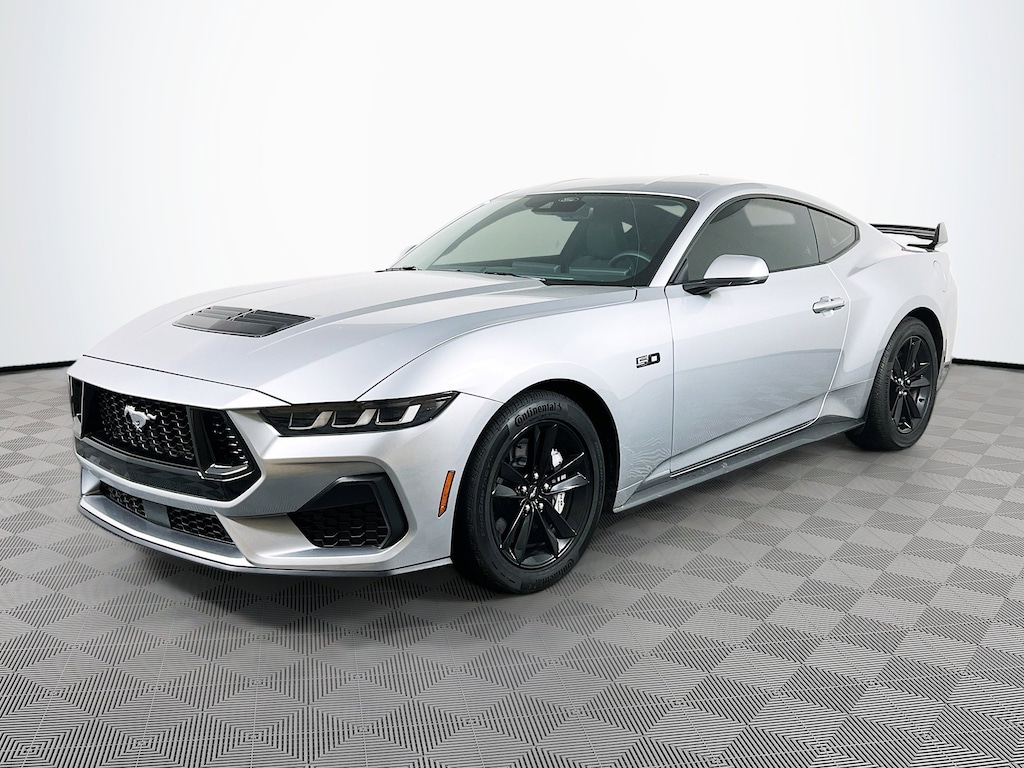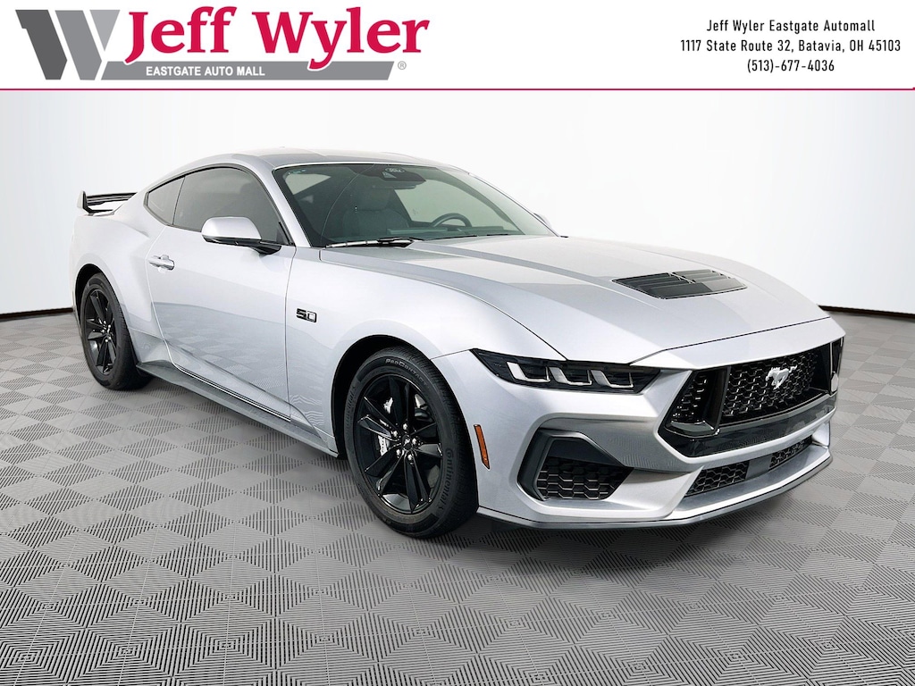 Jeff Wyler Eastgate Auto Mall is proud to offer this fantastic 2024 Ford Mustang GT in Iconic Silver Metallic. Well equipped with: Equipment Group 301A High Package, 4-Wheel Disc Brakes, ABS brakes, Active Valve Performance Exhaust, Air Conditioning, Alloy wheels, AM/FM Stereo, Auto High-beam Headlights, Automatic temperature control, Brake assist, Bumpers: body-color, Compass, Delay-off headlights, Driver door bin, Driver vanity mirror, Dual front impact airbags, Dual front side impact airbags, Electronic Stability Control, Emergency communication system: 911 Assist, Exterior Parking Camera Rear, Four wheel independent suspension, Front anti-roll bar, Front Bucket Seats, Front Center Armrest, Front reading lights, Fully automatic headlights, Illuminated entry, Knee airbag, Leather Shift Knob, Leather steering wheel, Low tire pressure warning, Occupant sensing airbag, Outside temperature display, Overhead airbag, Overhead console, Panic alarm, Passenger door bin, Passenger vanity mirror, Power door mirrors, Power steering, Power windows, Radio data system, Rain sensing wipers, Rear anti-roll bar, Rear Parking Sensors, Rear window defroster, Remote keyless entry, Speed control, Speed-sensing steering, Speed-Sensitive Wipers, Split folding rear seat, Spoiler, Sport steering wheel, Steering wheel mounted audio controls, SYNC 4.0 QNX, Tachometer, Telescoping steering wheel, Tilt steering wheel, Traction control, Trip computer, Variably intermittent wipers, Voltmeter, and Wheels: 18" x 8.5" Ebony Black Painted Aluminum. Clean CARFAX. Ask about available certifications. Used vehicles 10 years of age or newer with less than 100,000 miles are eligible for the Wyler Assurance Program, but eligible vehicles must pass our reconditioning process and multi-point inspection. Provided the vehicle passes inspection, vehicles will be eligible for the 6 month/6,000 mile limited warranty. The 6 month/6,000 mile limited warranty is NOT available on AS-IS vehicles, wholesale vehicles, lease buyback/pass-thru vehicles or un-inspected vehicles. Note that this program can also apply to vehicles where the remaining factory coverage is less than 6 months or 6,000 miles. Please check the Federal Trade Commission (FTC) Buyers guide on the vehicle for full details as to whether or not warranty coverage may apply. Contact Dealer for additional details. The Wyler Assurance 6 month/6,000 Mile limited warranty ends 6 months from the date of the Retail Purchase Agreement (BUYERS ORDER) or when the vehicle's odometer registers 6,000 additional miles to the mileage listed on the BUYERS ORDER, whichever comes first. Your Deductible - The warranty holder on your contract pays the first $100 of each covered repair.