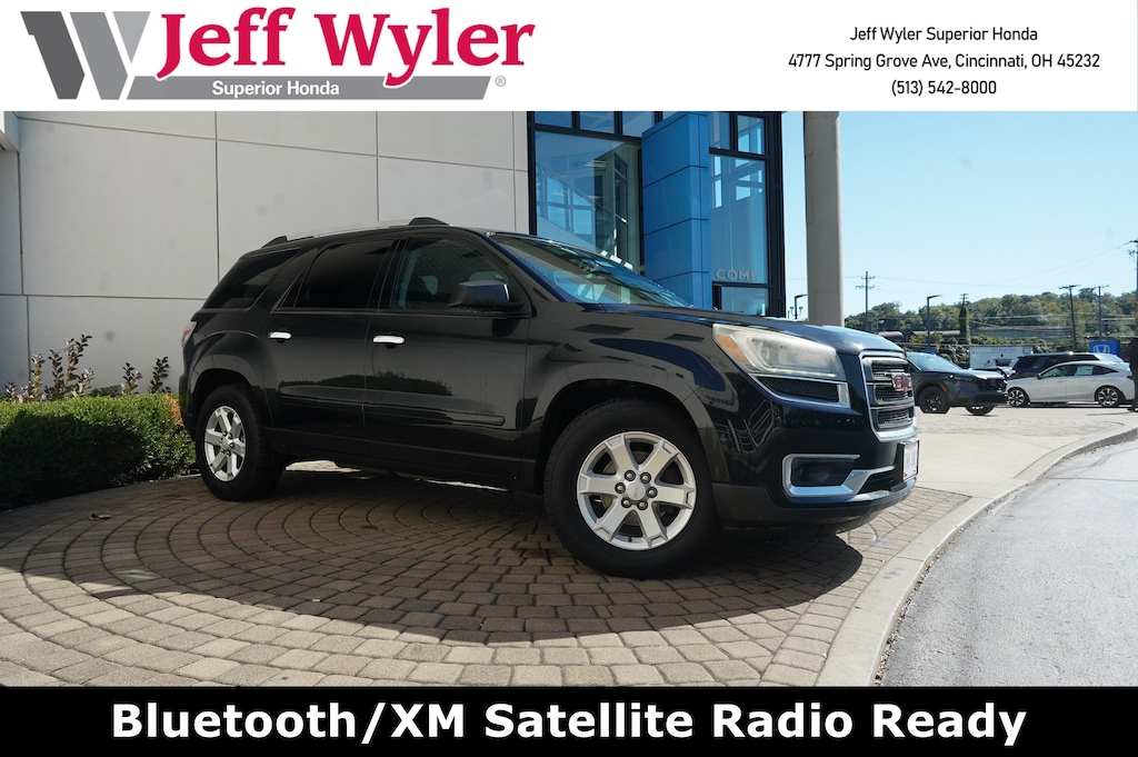 Jeff Wyler Superior Honda is delighted to offer this fantastic-looking 2014 GMC Acadia SLE-2 in Carbon Black Metallic. BLUETOOTH, LEATHER, MOONROOF SUNROOF, CLEAN CARFAX...NO ACCIDENTS, RECENT SUPERIOR TRADE, and ONE OWNER Acoustical Insulation Package, Preferred Equipment Group 3SB (2-Way Power Front Passenger Seat, 6-Speaker Audio System, 8-Way Power Driver Seat, Black Power-Adjustable Outside Mirrors, Body-Color Bodyside Moldings, Carpeted Removable Front 2nd & 3rd Row Floor Mats, Constant Effort Power Steering, Dual Downturn Tailpipe Exhaust, Inside Rear-View Auto-Dimming Mirror, Integral Spotter Blind-Zone Mirrors, Leather-Wrapped Steering Wheel, Power Rear Liftgate Body, Power Windows w/Driver Express-Down, Remote Vehicle Start, Single-Zone Manual Front Climate Control, Steering Wheel Mounted Audio Controls, and Tilt & Telescopic Steering Column), Trailering Equipment (Heavy-Duty Cooling System and Trailer Hitch), Acadia SLE-2, 4D Sport Utility, 3.6L V6 SIDI, 6-Speed Automatic, FWD, Carbon Black Metallic, Ebony Cloth, 18" x 7.5" Aluminum (4) Wheels, 3.16 Axle Ratio, 3rd row seats: split-bench, 4-Wheel Disc Brakes, 6 Speakers, 7-Passenger Seating (2-2-3 Seating Configuration), ABS brakes, Air Conditioning, Alloy wheels, AM/FM radio: SiriusXM, Auto-dimming Rear-View mirror, Bodyside moldings, Brake assist, Bumpers: body-color, CD player, Compass, Delay-off headlights, Driver door bin, Driver vanity mirror, Dual front impact airbags, Dual front side impact airbags, Electronic Stability Control, Emergency communication system: OnStar Directions & Connections, Exterior Parking Cameras, Four wheel independent suspension, Front anti-roll bar, Front Bucket Seats, Front Center Armrest w/Storage, Front License Plate Bracket, Front reading lights, Fully automatic headlights, Illuminated entry, Low tire pressure warning, Occupant sensing airbag, Outside temperature display, Overhead airbag, Overhead console, Panic alarm, Passenger door bin, Passenger vanity mirror, Power door mirrors, Power driver seat, Power Liftgate, Power passenger seat, Power steering, Power windows, Premium Cloth Seat Trim, Radio data system, Radio: Color Touch AM/FM/HD/CD w/IntelliLink, Rear air conditioning, Rear anti-roll bar, Rear reading lights, Rear window defroster, Rear window wiper, Reclining Bucket Seats, Remote keyless entry, Ride & Handling Suspension, Roof rack: rails only, SiriusXM Satellite Radio, Speed control, Spoiler, Steering wheel mounted audio controls, Tachometer, Telescoping steering wheel, Tilt steering wheel, Traction control, Trip computer, Variably intermittent wipers, and Voltmeter Our PRE-OWNED vehicles are put through a rigorous 167- POINT QUALITY ASSURANCE INSPECTION along with an average amount of over $1,400.00 SPENT to recondition each vehicle so we can be sure to deliver you the highest quality vehicle like you deserve! ***ONLINE PRICE DOES NOT INCLUDE WYLER FAMILY FIRST PACKAGE*** Stop by 4777 Spring Grove Ave. Road to see for yourself, or give us a call @ 283-209-1858 to schedule your test drive!