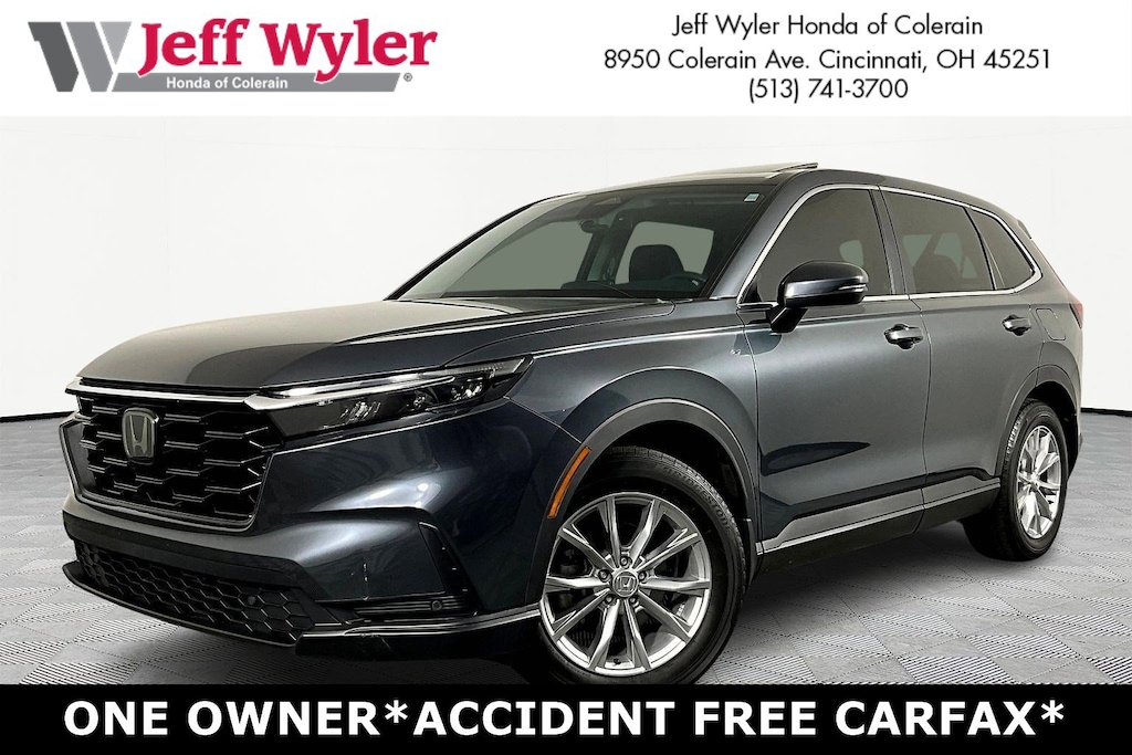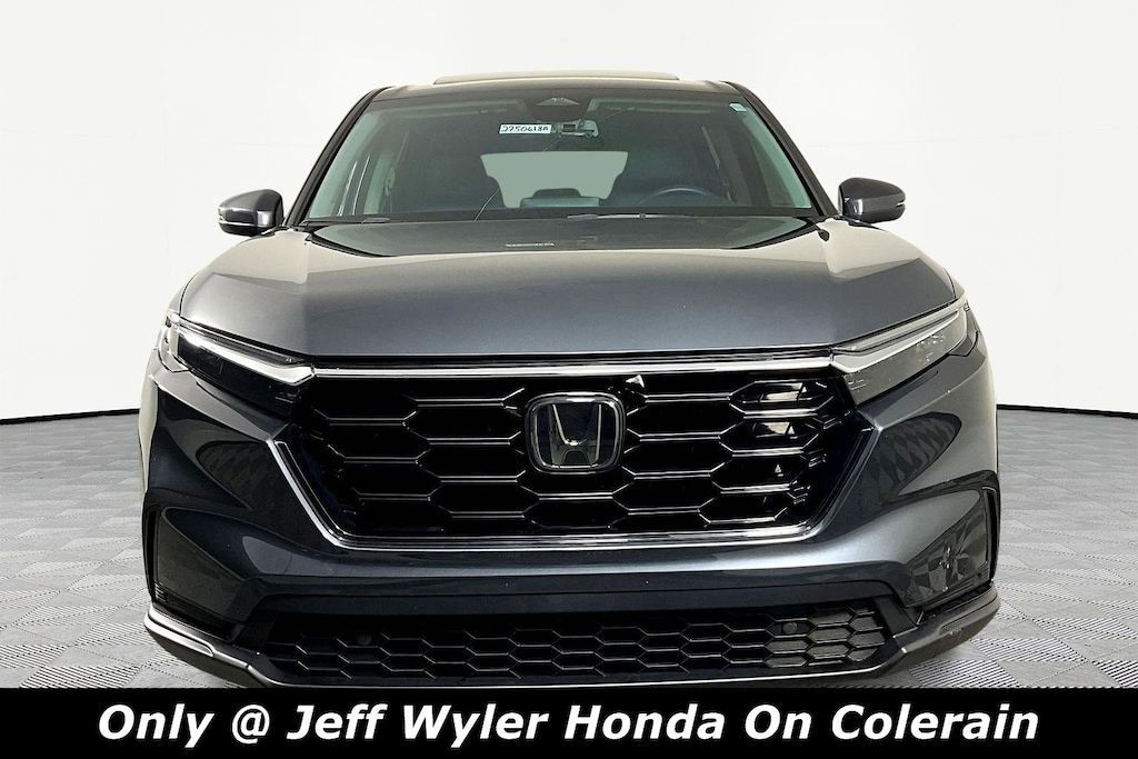 Jeff Wyler Honda of Colerain is pumped up to offer this terrific-looking 2023 Honda CR-V EX-L in Meteorite Gray Metallic. Well equipped with: 4-Wheel Disc Brakes, 5.64 Axle Ratio, 8 Speakers, ABS brakes, Adaptive Cruise Control: Adaptive Cruise Control (ACC) with Low-Speed Follow, Air Conditioning, Alloy wheels, AM/FM radio: SiriusXM, Auto High-beam Headlights, Auto-dimming Rear-View mirror, Automatic temperature control, Brake assist, Bumpers: body-color, Compass, Delay-off headlights, Driver door bin, Driver vanity mirror, Dual front impact airbags, Dual front side impact airbags, Electronic Stability Control, Exterior Parking Camera Rear, Four wheel independent suspension, Front anti-roll bar, Front Bucket Seats, Front Center Armrest, Front dual zone A/C, Front reading lights, Fully automatic headlights, Heated door mirrors, Heated Front Bucket Seats, Heated front seats, Illuminated entry, Knee airbag, Leather Seat Trim, Leather Shift Knob, Leather steering wheel, Low tire pressure warning, Memory seat, Occupant sensing airbag, Outside temperature display, Overhead airbag, Overhead console, Panic alarm, Passenger door bin, Passenger vanity mirror, Power door mirrors, Power driver seat, Power Liftgate, Power moonroof, Power passenger seat, Power steering, Power windows, Radio data system, Radio: 320-Watt AM/FM/HD/SiriusXM Audio System, Rear anti-roll bar, Rear reading lights, Rear seat center armrest, Rear side impact airbag, Rear window defroster, Rear window wiper, Remote keyless entry, Security system, Speed control, Speed-sensing steering, Speed-Sensitive Wipers, Split folding rear seat, Spoiler, Steering wheel mounted audio controls, Tachometer, Telescoping steering wheel, Tilt steering wheel, Traction control, Trip computer, Turn signal indicator mirrors, Variably intermittent wipers, Wheels: 18" Sparkle Silver Metallic, and Wireless Apple CarPlay/Wireless Android Auto.