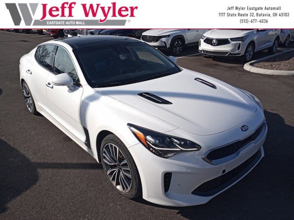 Jeff Wyler Eastgate Auto Mall is honored to offer this charming 2018 Kia Stinger Premium in Snow White Pearl. Well equipped with: 2.0T Advance Driver Assistance System Package (Auto Rain Sensing Wipers, Blind Spot Collision Warning, Driver Attention Warning, Forward Collision Avoidance, Forward Collision Warning System, Lane Departure Warning System, Lane Keeping Assist System, Rear Cross-Traffic Collision Warning, and Smart Cruise Control w/Stop & Go), 15 Speakers, 4-Wheel Disc Brakes, ABS brakes, Air Conditioning, Alloy wheels, AM/FM radio: SiriusXM, Anti-whiplash front head restraints, Apple CarPlay & Android Auto, Auto tilt-away steering wheel, Auto-dimming Rear-View mirror, Automatic temperature control, Brake assist, Bumpers: body-color, Cargo Net, Compass, Delay-off headlights, Driver door bin, Driver vanity mirror, Dual front impact airbags, Dual front side impact airbags, Electronic Stability Control, Emergency communication system: UVO eServices, Exterior Parking Camera Rear, Four wheel independent suspension, Front anti-roll bar, Front Bucket Seats, Front Center Armrest, Front dual zone A/C, Front reading lights, Fully automatic headlights, Garage door transmitter: HomeLink, harman/kardon® Speakers, Heated door mirrors, Heated Front Bucket Seats, Heated front seats, Heated steering wheel, Illuminated entry, Knee airbag, Leather Seat Trim, Low tire pressure warning, Memory seat, Navigation System, Occupant sensing airbag, Outside temperature display, Overhead airbag, Overhead console, Panic alarm, Passenger door bin, Passenger vanity mirror, Power door mirrors, Power driver seat, Power moonroof, Power passenger seat, Power steering, Power windows, Radio: AM/FM/MP3/HD/SiriusXM harmon/kardon Audio, Rear air conditioning, Rear anti-roll bar, Rear reading lights, Rear seat center armrest, Rear window defroster, Remote keyless entry, Security system, Speed control, Speed-Sensitive Wipers, Split folding rear seat, Spoiler, Steering wheel memory, Steering wheel mounted audio controls, Tachometer, Telescoping steering wheel, Tilt steering wheel, Traction control, Trip computer, Turn signal indicator mirrors, Variably intermittent wipers, Wheel Locks 18", and Wheels: 18" x 8J Machined Finish Alloy. Awards: * JD Power Automotive Performance, Execution and Layout (APEAL) Study * 2018 KBB.com 10 Favorite New-for-2018 Cars Ask about available certifications. Used vehicles 10 years of age or newer with less than 100,000 miles are eligible for the Wyler Assurance Program, but eligible vehicles must pass our reconditioning process and multi-point inspection. Provided the vehicle passes inspection, vehicles will be eligible for the 6 month/6,000 mile limited warranty. The 6 month/6,000 mile limited warranty is NOT available on AS-IS vehicles, wholesale vehicles, lease buyback/pass-thru vehicles or un-inspected vehicles. Note that this program can also apply to vehicles where the remaining factory coverage is less than 6 months or 6,000 miles. Please check the Federal Trade Commission (FTC) Buyers guide on the vehicle for full details as to whether or not warranty coverage may apply. Contact Dealer for additional details. The Wyler Assurance 6 month/6,000 Mile limited warranty ends 6 months from the date of the Retail Purchase Agreement (BUYERS ORDER) or when the vehicle's odometer registers 6,000 additional miles to the mileage listed on the BUYERS ORDER, whichever comes first. Your Deductible - The warranty holder on your contract pays the first $100 of each covered repair.