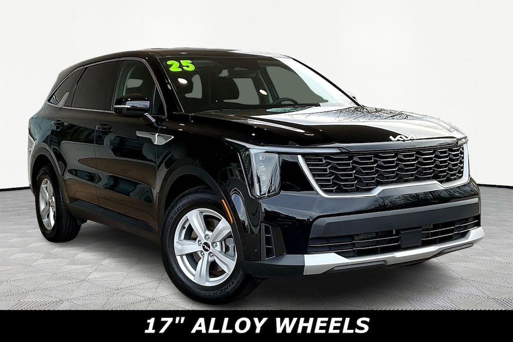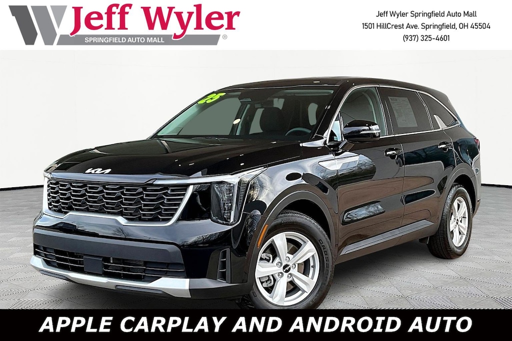 Jeff Wyler Springfield Auto Mall is very proud to offer this good-looking 2025 Kia Sorento LX in Ebony Black. Well equipped with: 17" Alloy Wheels, 3rd row seats: split-bench, 4-Wheel Disc Brakes, 6 Speakers, ABS brakes, Air Conditioning, Alloy wheels, AM/FM radio: SiriusXM, Apple CarPlay & Android Auto, Auto High-beam Headlights, Brake assist, Bumpers: body-color, Carpeted Floor Mats, Cloth Seat Trim, Delay-off headlights, Driver door bin, Driver vanity mirror, Dual front impact airbags, Dual front side impact airbags, Electronic Stability Control, Emergency communication system: 911 Connect, Exterior Parking Camera Rear, Four wheel independent suspension, Front anti-roll bar, Front Bucket Seats, Front Center Armrest, Front reading lights, Fully automatic headlights, Heated door mirrors, Illuminated entry, Knee airbag, Low tire pressure warning, Occupant sensing airbag, Outside temperature display, Overhead airbag, Overhead console, Panic alarm, Passenger door bin, Passenger vanity mirror, Power door mirrors, Power steering, Power windows, Radio data system, Radio: AM/FM Standard Sound System, Rear anti-roll bar, Rear reading lights, Rear seat center armrest, Rear side impact airbag, Rear window defroster, Rear window wiper, Remote keyless entry, Security system, Speed control, Speed-sensing steering, Split folding rear seat, Spoiler, Steering wheel mounted audio controls, Tachometer, Telescoping steering wheel, Tilt steering wheel, Traction control, Trip computer, Turn signal indicator mirrors, and Variably intermittent wipers. Ask about available certifications. Used vehicles 10 years of age or newer with less than 100,000 miles are eligible for the Wyler Assurance Program, but eligible vehicles must pass our reconditioning process and multi-point inspection. Provided the vehicle passes inspection, vehicles will be eligible for the 6 month/6,000 mile limited warranty. The 6 month/6,000 mile limited warranty is NOT available on AS-IS vehicles, wholesale vehicles, lease buyback/pass-thru vehicles or un-inspected vehicles. Note that this program can also apply to vehicles where the remaining factory coverage is less than 6 months or 6,000 miles. Please check the Federal Trade Commission (FTC) Buyers guide on the vehicle for full details as to whether or not warranty coverage may apply. Contact Dealer for additional details. The Wyler Assurance 6 month/6,000 Mile limited warranty ends 6 months from the date of the Retail Purchase Agreement (BUYERS ORDER) or when the vehicle's odometer registers 6,000 additional miles to the mileage listed on the BUYERS ORDER, whichever comes first. Your Deductible - The warranty holder on your contract pays the first $100 of each covered repair.