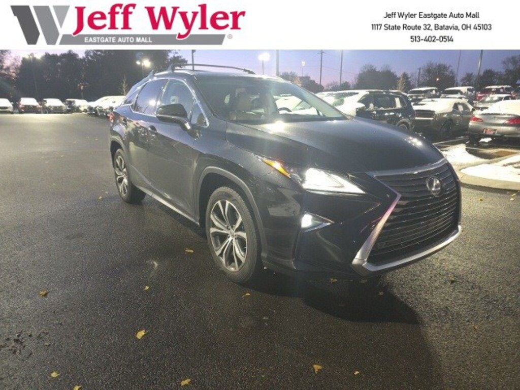 Jeff Wyler Eastgate Auto Mall is delighted to offer this great 2017 Lexus RX in . Well equipped with: 2.277 Axle Ratio, 4-Wheel Disc Brakes, 9 Speakers, ABS brakes, Air Conditioning, Alloy wheels, Aluminum Roof Rails, AM/FM radio: SiriusXM, Anti-whiplash front head restraints, Auto High-beam Headlights, Auto-dimming Rear-View mirror, Automatic temperature control, Backup Monitor, Bumpers: body-color, CD player, Compass, Delay-off headlights, Driver door bin, Driver vanity mirror, Dual front impact airbags, Dual front side impact airbags, Electronic Stability Control, Emergency communication system: Safety Connect, Exterior Parking Camera Rear, Four wheel independent suspension, Front anti-roll bar, Front Bucket Seats, Front Center Armrest, Front dual zone A/C, Front fog lights, Front reading lights, Fully automatic headlights, Garage door transmitter: HomeLink, Heated door mirrors, Illuminated entry, Knee airbag, Leather Shift Knob, Leather steering wheel, Low tire pressure warning, Occupant sensing airbag, Outside temperature display, Overhead airbag, Overhead console, Panic alarm, Passenger door bin, Passenger vanity mirror, Power door mirrors, Power driver seat, Power Liftgate, Power passenger seat, Power steering, Power windows, Radio data system, Radio: AM/FM/CD Lexus Display Audio, Rain sensing wipers, Rear anti-roll bar, Rear reading lights, Rear seat center armrest, Rear side impact airbag, Rear window defroster, Rear window wiper, Remote keyless entry, Security system, Speed control, Speed-sensing steering, Split folding rear seat, Spoiler, Steering wheel mounted audio controls, Tachometer, Telescoping steering wheel, Tilt steering wheel, Traction control, Trip computer, Turn signal indicator mirrors, and Variably intermittent wipers. Awards: * 2017 KBB.com 10 Best Luxury SUVs * 2017 KBB.com Best Resale Value Awards * 2017 KBB.com Brand Image Awards Ask about available certifications. Used vehicles 10 years of age or newer with less than 100,000 miles are eligible for the Wyler Assurance Program, but eligible vehicles must pass our reconditioning process and multi-point inspection. Provided the vehicle passes inspection, vehicles will be eligible for the 6 month/6,000 mile limited warranty. The 6 month/6,000 mile limited warranty is NOT available on AS-IS vehicles, wholesale vehicles, lease buyback/pass-thru vehicles or un-inspected vehicles. Note that this program can also apply to vehicles where the remaining factory coverage is less than 6 months or 6,000 miles. Please check the Federal Trade Commission (FTC) Buyers guide on the vehicle for full details as to whether or not warranty coverage may apply. Contact Dealer for additional details. The Wyler Assurance 6 month/6,000 Mile limited warranty ends 6 months from the date of the Retail Purchase Agreement (BUYERS ORDER) or when the vehicle's odometer registers 6,000 additional miles to the mileage listed on the BUYERS ORDER, whichever comes first. Your Deductible - The warranty holder on your contract pays the first $100 of each covered repair.