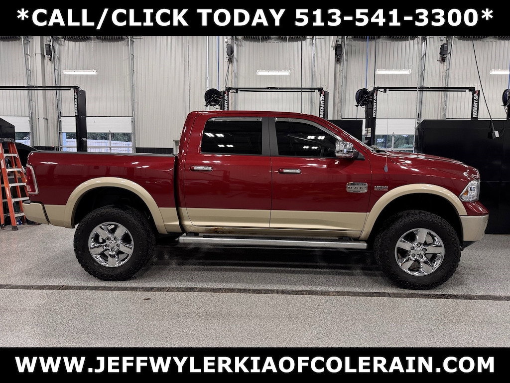 Jeff Wyler Kia of Colerain is honored to offer this great-looking 2013 Ram 1500 Laramie Longhorn in Deep Cherry Red Crystal Pearlcoat. Convenience Group (Auto High Beam Headlamp Control, Keyless Enter-N-Go, Rain Sensitive Windshield Wipers, and Remote Proximity Keyless Entry), Protection Group, Quick Order Package 25K Laramie Longhorn (DISC), 10 Speakers, 115V Auxiliary Power Outlet, 20" x 9" Aluminum Polished/Gold Inserts Wheels, 3.92 Rear Axle Ratio, 4-Wheel Disc Brakes, ABS brakes, Adjustable pedals, Air Conditioning, Alloy wheels, AM/FM radio: SiriusXM, Anti-Spin Differential Rear Axle, Audio memory, Auto-dimming door mirrors, Auto-dimming Rear-View mirror, Automatic temperature control, Brake assist, Bucket Seats, Chrome Exterior Mirrors, Chrome Tubular Side Steps, Class IV Receiver Hitch, Compass, Delay-off headlights, Driver door bin, Driver vanity mirror, Dual front impact airbags, Dual front side impact airbags, Electronic Stability Control, Emergency communication system, Exterior Mirrors Courtesy Lamps, Exterior Mirrors w/Heating Element, Exterior Mirrors w/Memory, Exterior Mirrors w/Supplemental Signals, Front anti-roll bar, Front Bucket Seats, Front Center Armrest w/Storage, Front dual zone A/C, Front fog lights, Front reading lights, Front wheel independent suspension, Fully automatic headlights, Garage door transmitter, Genuine wood dashboard insert, Genuine wood door panel insert, Heated door mirrors, Heated Front Seats, Heated front seats, Heated rear seats, Heated Second Row Seats, Heated Steering Wheel, Heated steering wheel, High Back Seats, Illuminated entry, Leather Shift Knob, Leather steering wheel, Low tire pressure warning, Memory seat, Navigation System, Occupant sensing airbag, Outside temperature display, Overhead airbag, Overhead console, Panic alarm, Passenger door bin, Passenger vanity mirror, Pedal memory, Power door mirrors, Power driver seat, Power passenger seat, Power steering, Power Sunroof, Power windows, Premium Filigree Leather Seats, Radio data system, Radio: Uconnect 8.4AN AM/FM/BT/Access/NAV, Rear 60/40 Split Folding Seat, Rear anti-roll bar, Rear seat center armrest, Rear step bumper, Remote keyless entry, Security system, Single Disc Remote CD Player, Speed control, Split folding rear seat, Steering Wheel Mounted Audio Controls, Steering wheel mounted audio controls, Tachometer, Tilt steering wheel, Traction control, Trailer Brake Control, Tri-Fold Tonneau Cover, Trip computer, Turn signal indicator mirrors, Variably intermittent wipers, Ventilated Front Seats, Ventilated front seats, and Voltmeter Our PRE-OWNED vehicles are put through a rigorous 167- POINT QUALITY ASSURANCE INSPECTION along with an average amount of over $1,400.00 SPENT to recondition each vehicle so we can be sure to deliver you the highest quality vehicle like you deserve! ***ONLINE PRICE DOES NOT INCLUDE WYLER FAMILY FIRST PACKAGE***