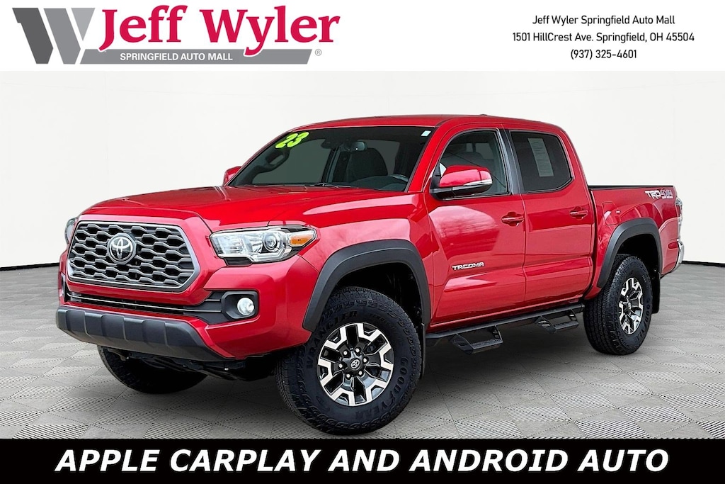 Jeff Wyler Springfield Auto Mall is delighted to offer this wonderful 2023 Toyota Tacoma TRD Off-Road in Red. Well equipped with: ABS brakes, Alloy wheels, Electronic Stability Control, Front dual zone A/C, Heated door mirrors, Illuminated entry, Low tire pressure warning, Remote keyless entry, Traction control, 120V/400W Deck Mounted AC Power, 6 Speakers, Air Conditioning, AM/FM radio: SiriusXM, Anti-whiplash front head restraints, Apple CarPlay/Android Auto, Auto High-beam Headlights, Auto-dimming Rear-View mirror, Auto-Dimming Rearview Mirror w/HomeLink, Automatic temperature control, Black Overfenders, Brake assist, Bumpers: body-color, Driver door bin, Dual front impact airbags, Dual front side impact airbags, Emergency communication system: Safety Connect (1-year trial), Engine Immobilizer, Exterior Parking Camera Rear, Fabric Seat Trim, Front anti-roll bar, Front Bucket Seats, Front Center Armrest, Front fog lights, Front reading lights, Front Seats, Front wheel independent suspension, Garage door transmitter: HomeLink, Knee airbag, Leather Shift Knob, Occupant sensing airbag, Outside temperature display, Overhead airbag, Overhead console, Panic alarm, Passenger door bin, Power door mirrors, Power driver seat, Power Sliding Rear Window w/Privacy Glass, Power steering, Power windows, Radio: Audio, Rear step bumper, Security system, Speed control, Speed-sensing steering, Split folding rear seat, Steering wheel mounted audio controls, Tachometer, Telescoping steering wheel, Tilt steering wheel, Trip computer, Turn signal indicator mirrors, Variably intermittent wipers, and Wheels: 16" Machined Contrast Alloy. Ask about available certifications. Used vehicles 10 years of age or newer with less than 100,000 miles are eligible for the Wyler Assurance Program, but eligible vehicles must pass our reconditioning process and multi-point inspection. Provided the vehicle passes inspection, vehicles will be eligible for the 6 month/6,000 mile limited warranty. The 6 month/6,000 mile limited warranty is NOT available on AS-IS vehicles, wholesale vehicles, lease buyback/pass-thru vehicles or un-inspected vehicles. Note that this program can also apply to vehicles where the remaining factory coverage is less than 6 months or 6,000 miles. Please check the Federal Trade Commission (FTC) Buyers guide on the vehicle for full details as to whether or not warranty coverage may apply. Contact Dealer for additional details. The Wyler Assurance 6 month/6,000 Mile limited warranty ends 6 months from the date of the Retail Purchase Agreement (BUYERS ORDER) or when the vehicle's odometer registers 6,000 additional miles to the mileage listed on the BUYERS ORDER, whichever comes first. Your Deductible - The warranty holder on your contract pays the first $100 of each covered repair.